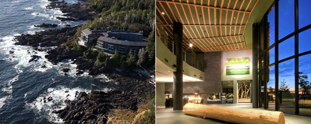 It stands, as you may imagine, on the oceanfront, atop a black rock promontory, and while from the outside it keeps a respectful low profile, from the inside it’s all soaring spaces and acres of glass, the better to take in the stunning view of the ocean off the coast of Vancouver Island. Rooms are crisp and modern, clean-lined in subtle colors, and again, the view is the thing: if not towards the ocean, then at least out into the rainforest, which isn’t hard on the eyes either.