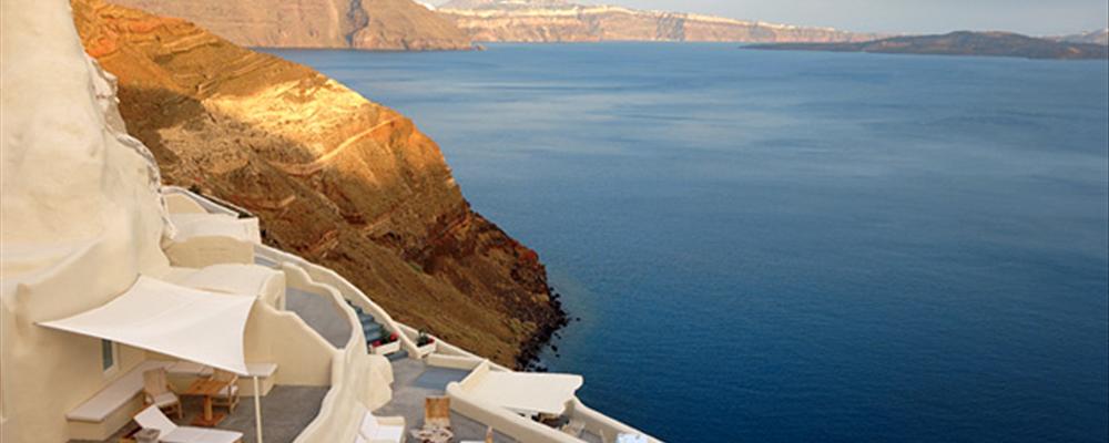 As for creature comforts, you’ll find enough to keep you comfortably ensconced at the edge of the caldera just about forever. The bar by the poolside serves cocktails and light mid-day fare, and the guests-only restaurant seats diners at the terrace’s edge with as stunning a backdrop as you could ask for. No wonder it’s a favorite for honeymooners — and, one imagines, the site of many an unplanned proposal as well.