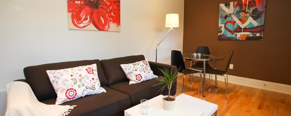 Red, bright white, cream and grey linens, artwork and furniture are featured throughout this modern apartment. Located in the Mission District, Mission Dolores Park is just 20 minutes’ walk away.